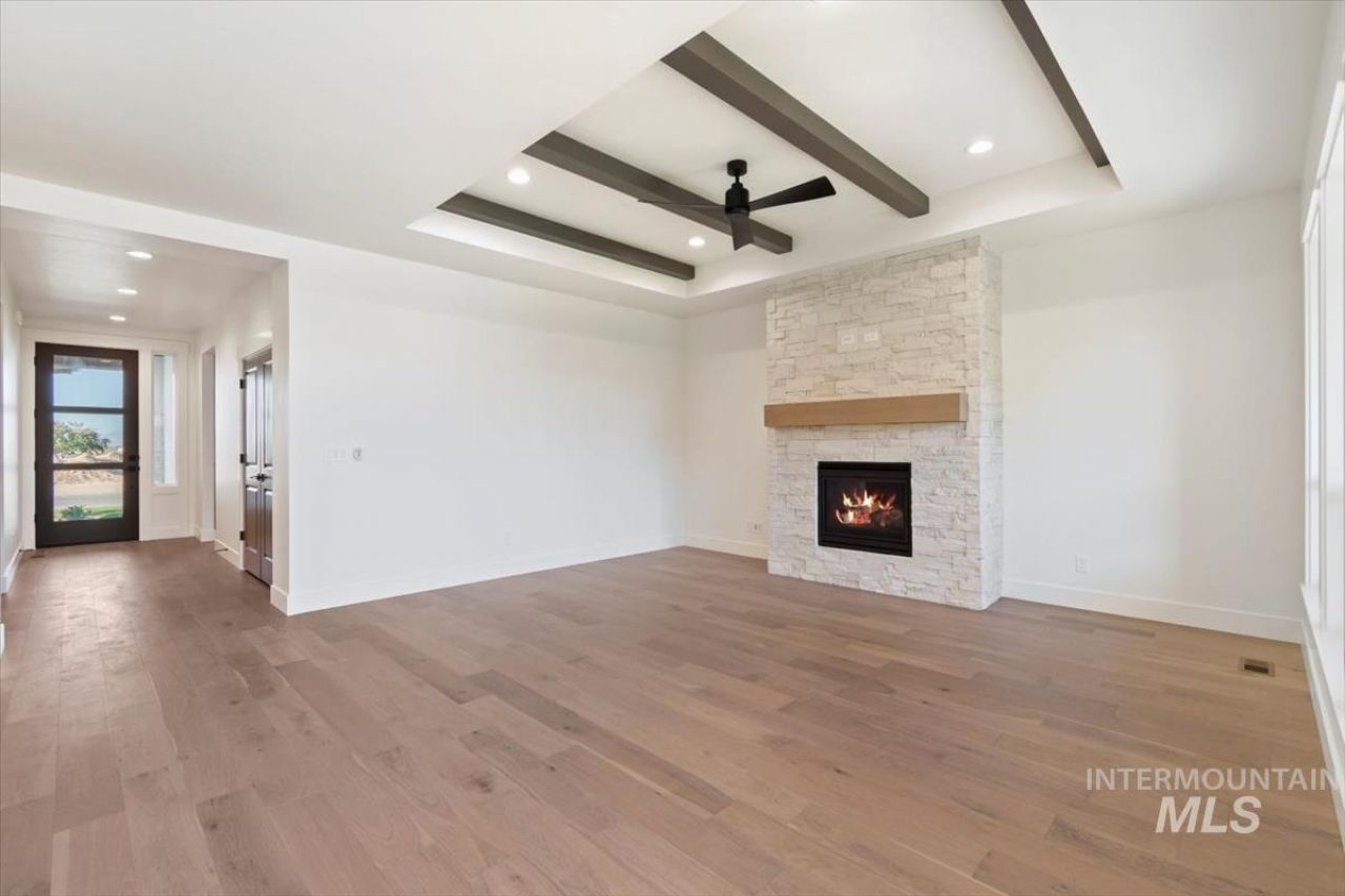 Welcome to the Milan by Tresidio Homes in Valor, Kunas premier golf course community! This thoughtfully designed single-level home offers 3 bedrooms, 2 bathrooms, and a spacious open-concept layout perfect for everyday living and entertaining. The great room features beautiful wood flooring, a floor-to-ceiling stone fireplace, and painted beam ceiling detail, flowing seamlessly into the kitchen. The kitchen showcases ceiling-height cabinetry with glass accents, Miami White quartz countertops, KitchenAid appliances including a 30 combo wall oven with air fry mode, gas cooktop, large island, and matte black fixtures throughout. The private primary suite includes a tray ceiling, dual vanities, quartz countertops and floor-to-ceiling tiled shower. The secondary bathroom also features quartz countertops and a full tile tub surround for a cohesive, elevated finish. Enjoy outdoor living under the covered patio. Front and rear landscaping and fencing included. Modern Farmstyle elevation (photo similar). Dont miss this opportunity to own in the incredible Valor community! Call me today for more information