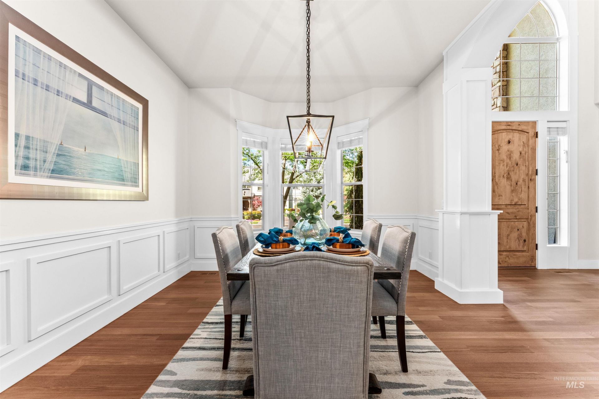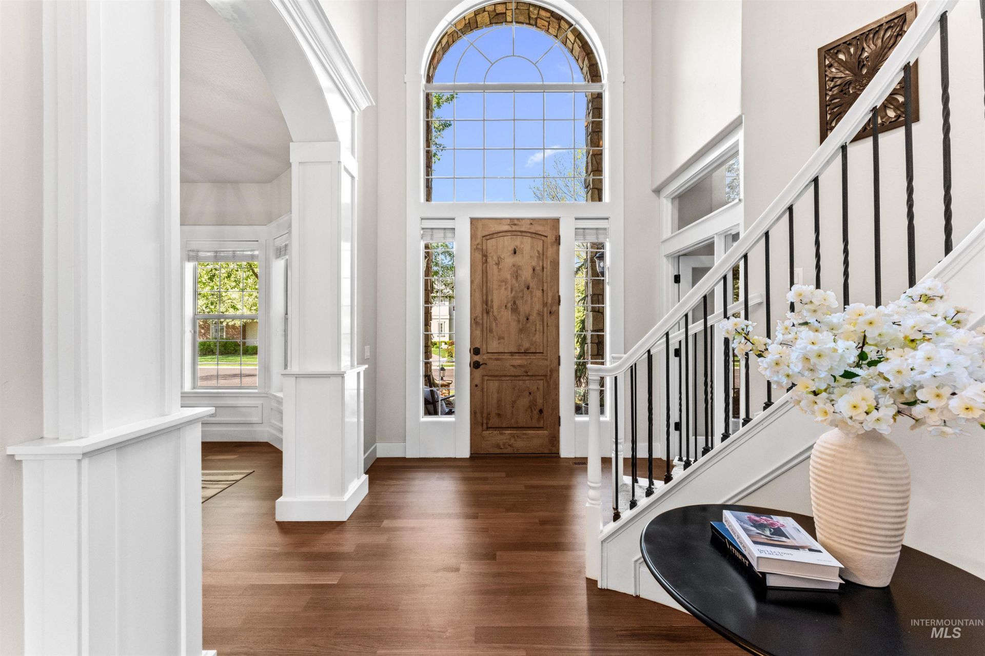 Located in the heart of Eagle in the highly sought after neighborhood of Rivers End. This exceptional residence offers a refined design, quality craftsmanship and seamless indoor-outdoor living. Ideally positioned on a .34 acre corner lot, this home sits directly across from the Boise River Trail/Greenbelt, with easy access to Eagles top restaurants, shopping, schools and outdoor recreation. This very functionally designed floor plan features abundant natural light, craftsman moulding throughout, newly refinished hardwood floors and a stunning floor-to-ceiling stone fireplace that is the focal point in the great room. A large gourmet kitchen is equipped with a pot filler and stainless steel appliances including a new double oven. A cozy breakfast nook sits near the kitchen. A large office with bay windows including crown moulding provides a dedicated work space. A huge main level primary suite offers dual vanities, a soaking jacuzzi tub, a large walk in closet and a beautiful floor to ceiling tiled walk in shower. An additional bedroom downstairs with adjacent full bath offers flexible living options for guests or multigenerational needs. Upstairs youll find 3 more bedrooms, 2 baths and a huge bonus room. Step outside and enjoy your own landscaped oasis that includes a large covered patio, stamped concrete, built in gas fire pit and raised garden boxes. Oversized 3 car garage.