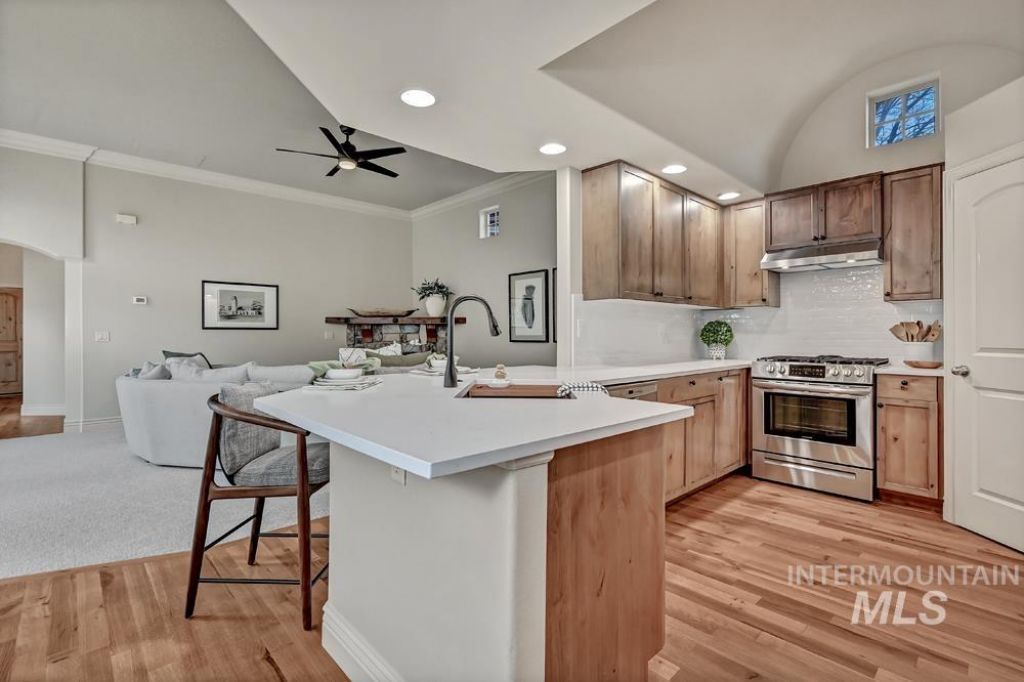 Nestled in the award-winning community of Hidden Springs in the Boise foothills, this beautifully updated single-level home offers a perfect blend of comfort, style, and ease of living. The entryway greets you with a stunning barrel ceiling, setting the tone for the thoughtful design found throughout, including soaring 12-foot ceilings in the great room and dining area, along with timeless crown molding & trim. Freshly refinished hardwood floors, all-new carpet, and new interior & exterior paint create a crisp, move-in-ready feel. The kitchen features quartz countertops and an inviting layout that flows seamlessly into the main living spaces?ideal for both everyday living and hosting guests. A dedicated office or den provides flexible space for work, hobbies, or quiet retreat. The spacious primary en-suite offers a relaxing escape with a soaking tub, dual vanities, and a generous walk-in closet. Step outside to a private courtyard with an outdoor fireplace?perfect for enjoying peaceful mornings or cozy evenings. Hidden Springs is known for its exceptional lifestyle, offering 988 acres of open space, miles of trails and sidewalks, direct Ridge to Rivers access, two community pools, a fitness center, community center, event barn, garden, library, and the charming Spring House Mercantile just moments away.