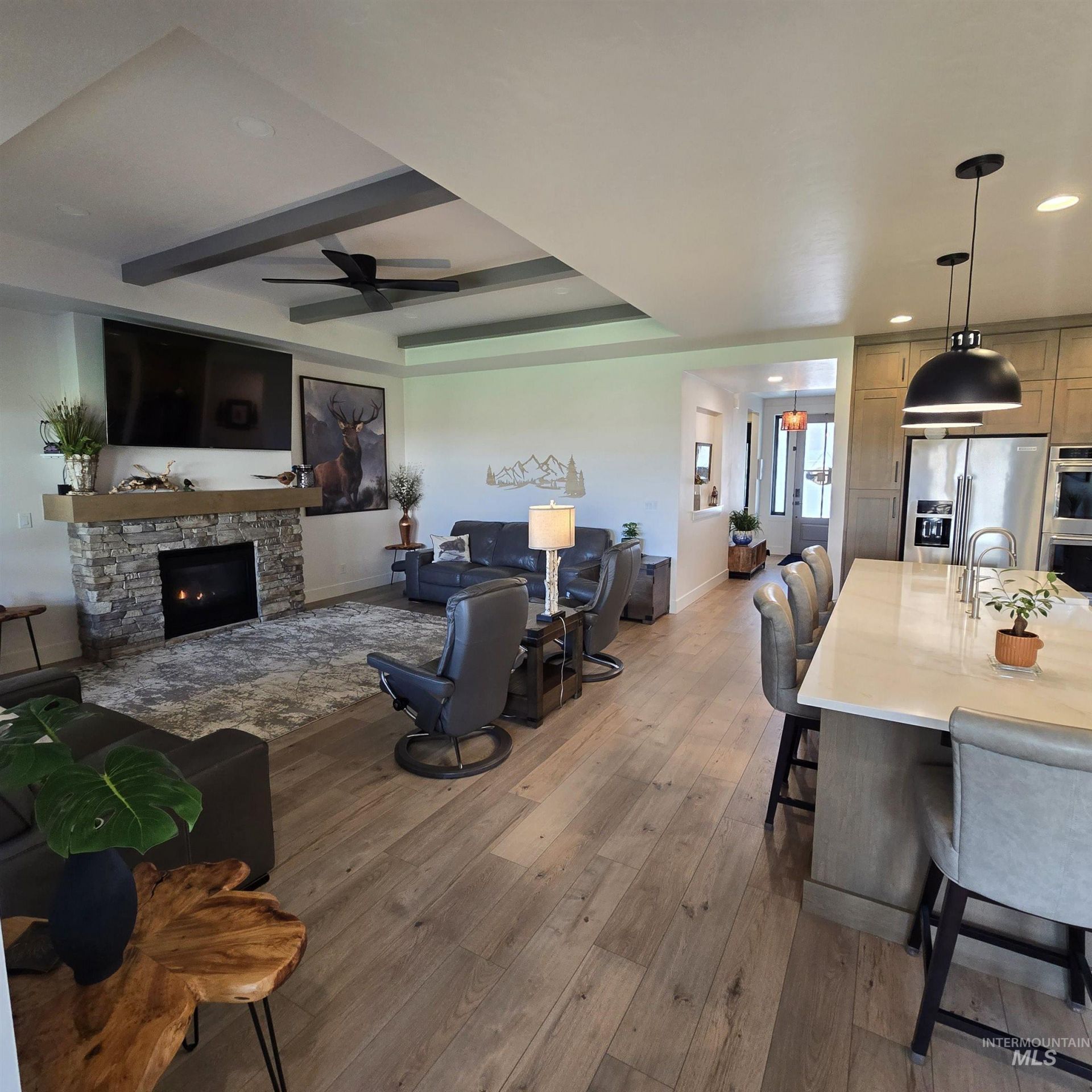 Welcome to your dream home in the highly sought-after Indian Creek Ranch community! Situated on a prime quarter-acre lot with over $60,000 in upgrades, this home blends luxury and functionality. Enjoy a 2+ car extended RV garage, side yard access, and two storage sheds?perfect for vehicles, toys, and tools. Inside, the open floor plan features beautiful engineered hardwood flooring throughout. The great room showcases a 10-foot tray ceiling with beam detail and a stunning natural gas fireplace with wrap-around mantle. The gourmet kitchen includes stainless steel appliances, double ovens, a farmhouse sink, extended quartz countertops, and a walk-in pantry with a sink?ideal for a coffee bar. The primary suite offers a spa-like bath with dual quartz vanities, soaking tub, walk-in tile shower with seating and dual heads, plus a large closet connected to the laundry room. Two additional bedrooms and a full bath provide comfort for guests. A mudroom entry and nearby half bath add convenience. Step outside to a large covered patio and expansive backyard?perfect for entertaining. Community amenities include a park, pickleball courts, pool, and scenic creekside trail.