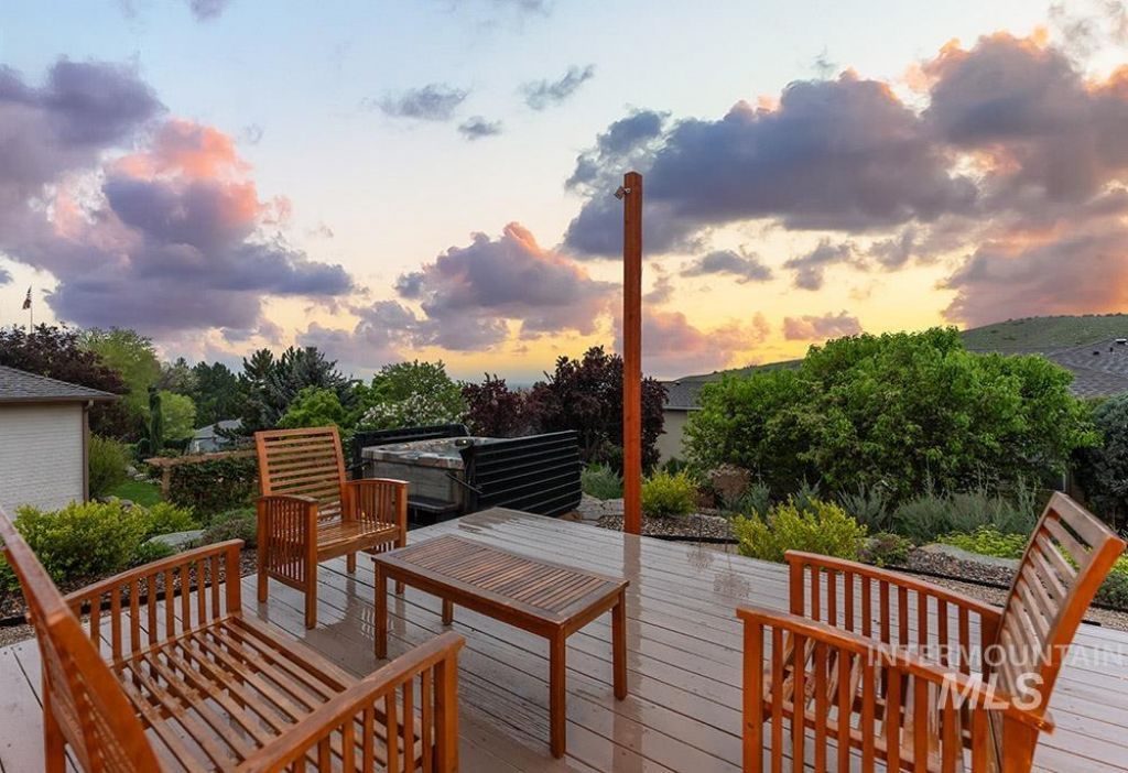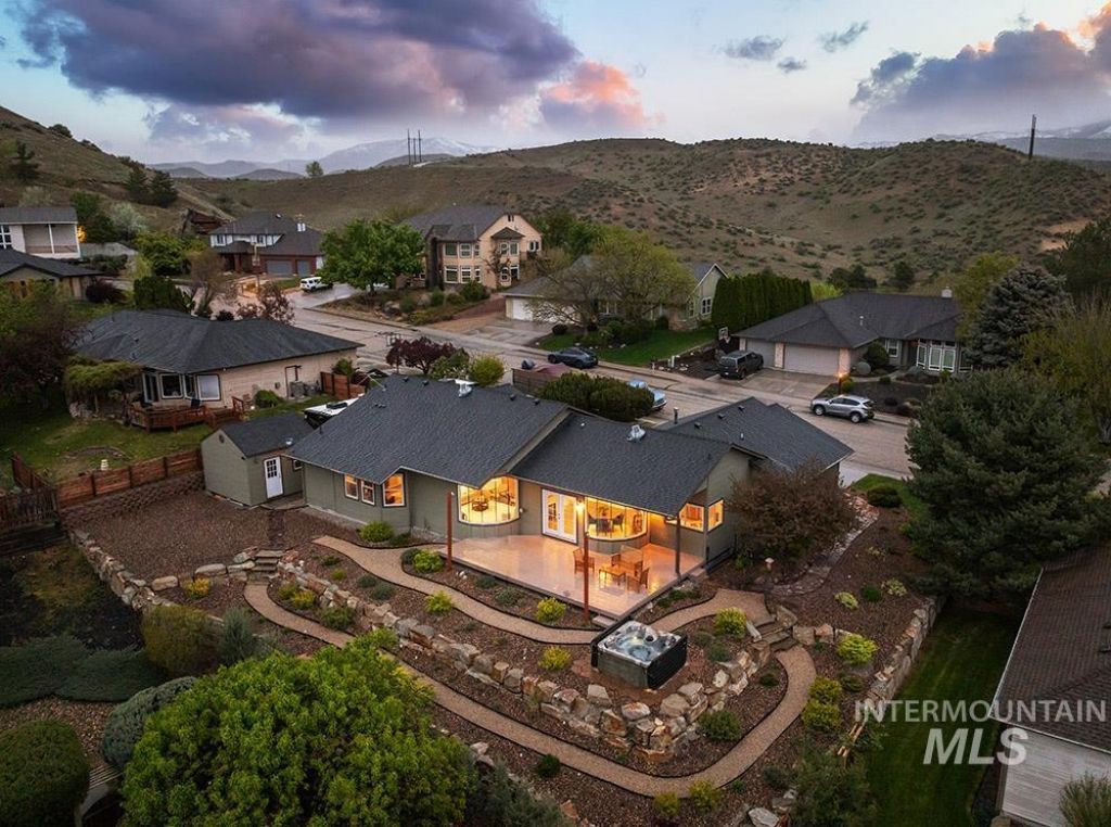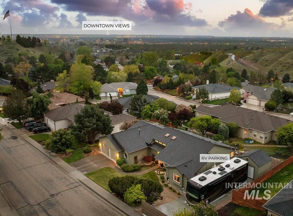 Rare single-level in the North Boise foothills showcasing stunning downtown and foothill views with RV parking with no HOA dues. Perched just above the North End, this location offers quick access to foothill trails, just minutes to Crane Creek and Hyde Park, and an easy, direct route to both downtown and Bogus Basin. The meticulously maintained home features true single-level living on over a quarter acre, complete with gated RV parking and a low-maintenance xeriscaped yard. Inside, curved architectural windows frame the views, filling the space with natural light. The open-concept layout is anchored by a double-sided fireplace, hardwood flooring, and an inviting kitchen with honed granite countertops, subway tile backsplash, and breakfast bar seating. The primary suite offers hardwood floors, incredible views, and a well-appointed en suite bath with dual vanities, a fully tiled walk-in shower, and a spacious walk-in closet. Outdoor living shines with a large entertaining deck and thoughtfully designed xeriscaping for easy upkeep. A flagstone patio leads to a hot tub area with sweeping city views. Additional features include a versatile storage shed with a garage door for smaller vehicles/toys or gear, plus dedicated side-yard RV parking with hookups.