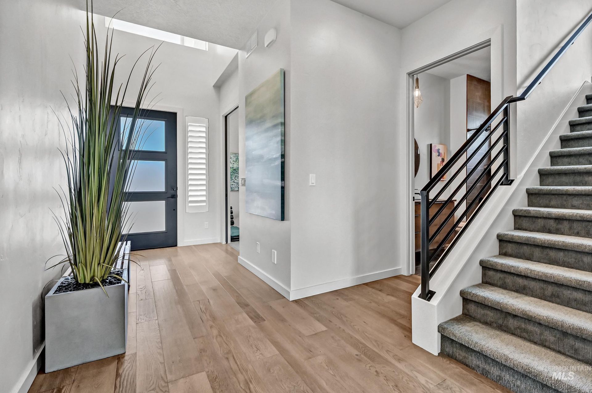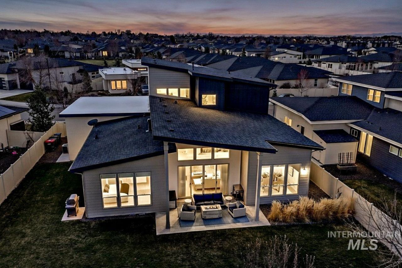 Striking architectural design defines this refined modern luxury home in Movado Estates, one of Meridians most desirable communities. The stunning main-level primary suite offers a private retreat featuring a spa-inspired bath with a freestanding soaking tub, walk-in shower, dual vanities, and a spacious walk-in closet. An adjoining laundry room adds everyday convenience. A second bedroom or office and full bath on the main level provide exceptional flexibility for guests or remote work. Designed for both daily living and entertaining, the chef-inspired kitchen showcases a large quartz island, premium cabinetry, high-end appliances, and a butlers pantry. The open-concept great room features soaring 18-foot ceilings, expansive windows that flood the home with natural light, and a dramatic feature-wall gas fireplace. Enjoy seamless indoor-outdoor living with an expansive covered patio overlooking Five Mile Creek and captivating mountain views?perfect for relaxing or hosting gatherings. The upper level offers a spacious second great room, two additional bedrooms, a full bath, and versatile multi-use spaces?an ideal retreat for the younger generation or extended living. Additional highlights include abundant storage throughout, an oversized three-car garage, and the exciting potential for a future rooftop balcony to take full advantage of the surrounding views.