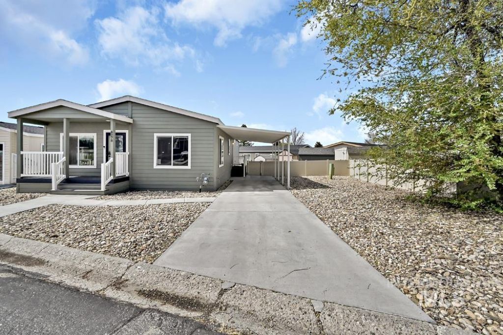 Welcome to effortless living in a desirable Boise area with easy, quick access to the interstate and a low maintenance lifestyle that is hard to beat. This peaceful and well-maintained Blue Valley Park is situated in Southeast Boise. The community offers a quieter setting with convenient access to downtown, the airport, shopping, and outdoor recreation at Lucky Peak Reservoir, just minutes away. Youll enjoy the outdoor space and proximity to the neighborhood pond. The home offers a covered front porch and warm and inviting atmosphere. The open-concept layout offers expansive windows that fill the space with natural light. The kitchen is equipped with upgraded stainless steel appliances, including the refrigerator and gas range. This newer home built in 2022 is complete with a vinyl fenced yard and a carport and shed for added storage. Lot rent is $695/month.